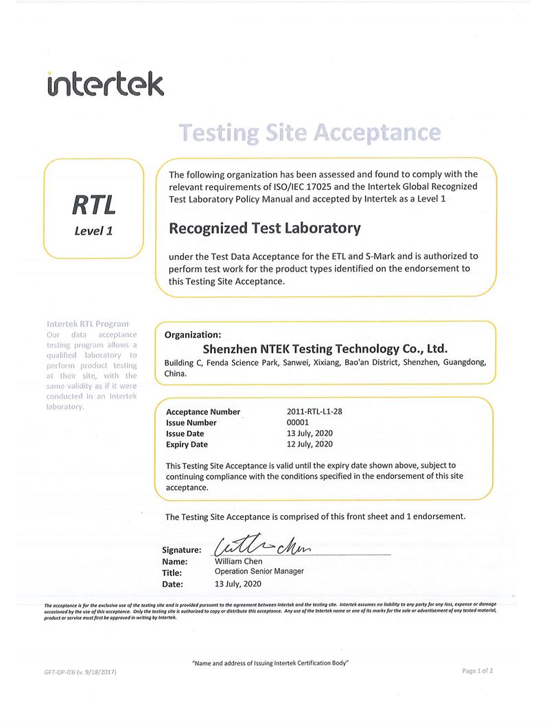 NTEK实验室严格按照 ISO/IEC 17025:2017标准建立与实施管理,并通过中国合格评定国家认可委员会(CNAS:L5516)和国际实验室认可合作组织(ILAC)认可的实验室。获得国家质量监督检验检疫总局颁发的进出口商品检验鉴定机构资格证书,是国家强制性产品认证(CCC)指定实验室、中国质量认证中心(CQC)签约检测实验室、计量认证(CMA)实验室。